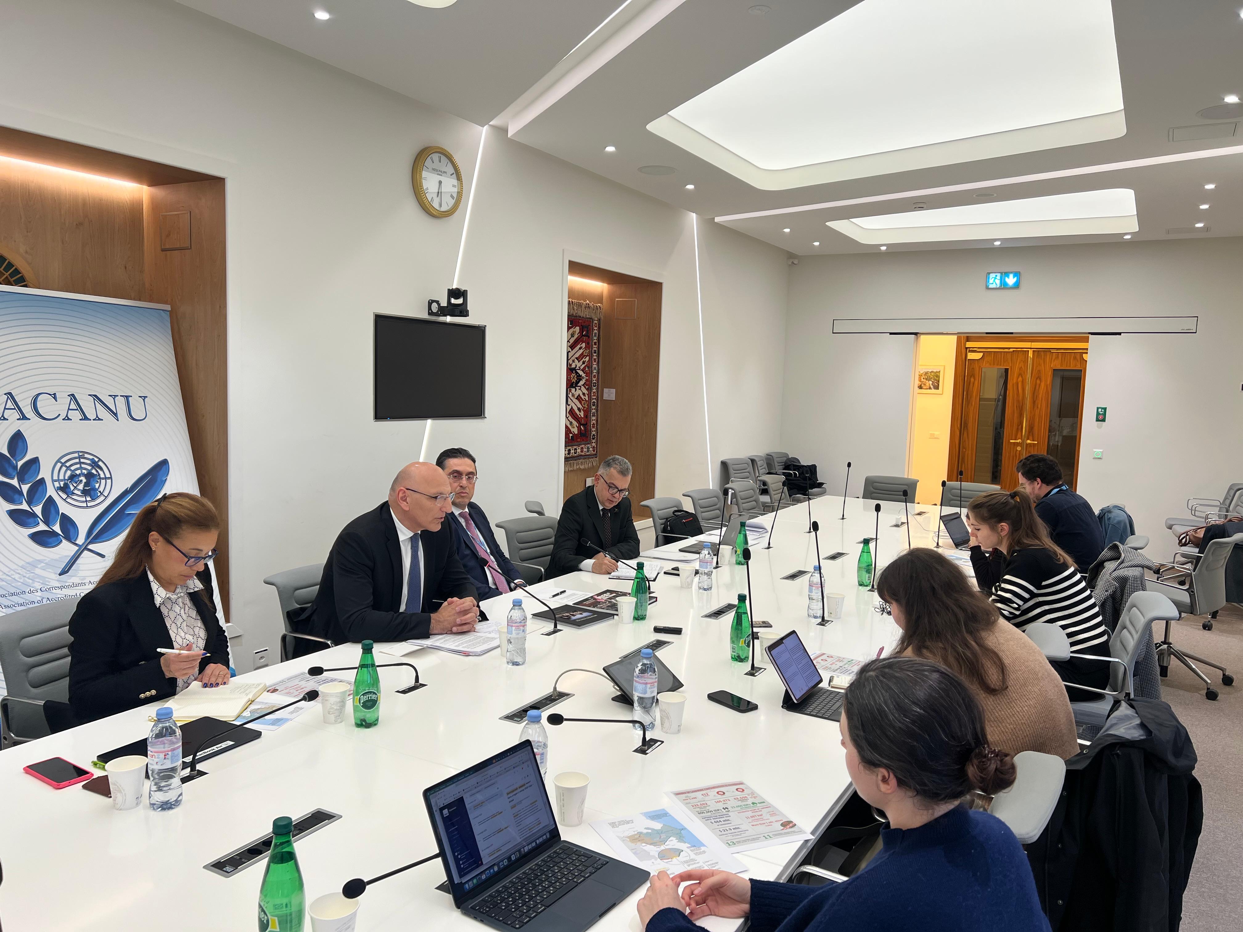 Səfər çərçivəsində Elçin Əmirbəyov həmçinin Birləşmiş Millətlər Təşkilatının Cenevrədəki Bölməsində akreditə olunmuş jurnalistlər üçün mətbuat brifinqi keçirmişdir. Brifinq zamanı Prezidentinin nümayəndəsi Azərbaycan-Ermənistan sülh prosesinin indiki durumu və perspektivləri, regionda sülhün və inkişafının möhkəmləndirilməsi istiqamətində Azərbayacan tərəfindən atılan addımlar, Azərbaycan və Ermənistan vətəndaş cəmiyyətləri arasında qarşılıqlı etimadın gücləndiriləmisən yönələn dialoq, Azərbaycanın üzləşdiyi mina problemi və işğal zamanı dağıdılmış mədəni irsimiz, Orta Dəhlizinin genişləndirilməsi üçün Cənubi Qafqazda nəqliyyat bağlantılarının açılmasının əhəmiyyəti kimi məsələlərə dair jurnalistlərinin çoxsaylı suallarını cavablandırmışdır.